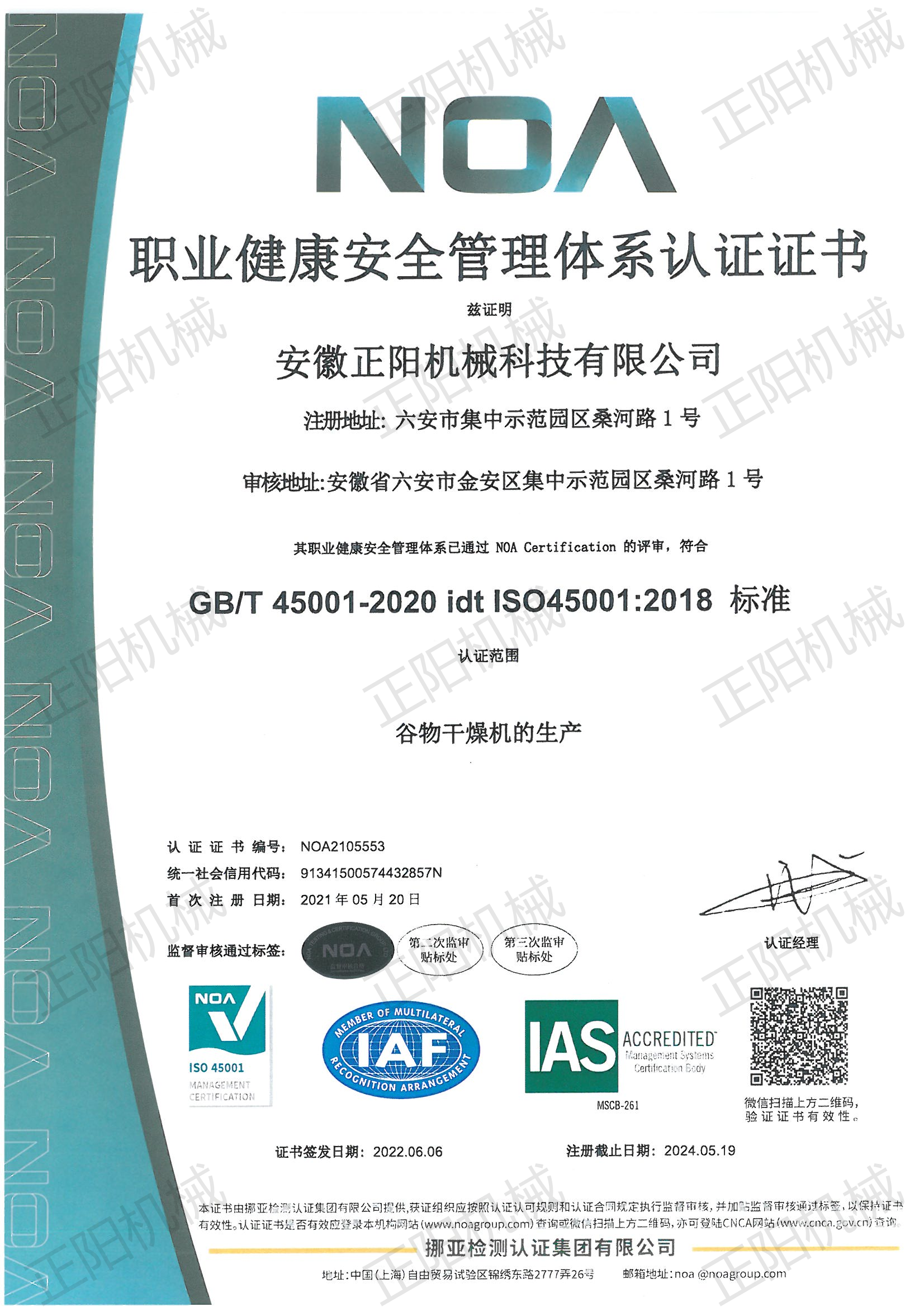職業(yè)健康安全管理體系認證證書