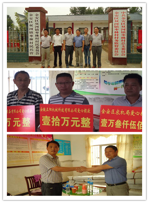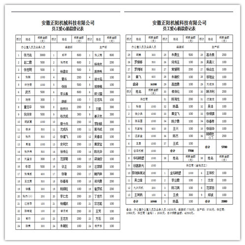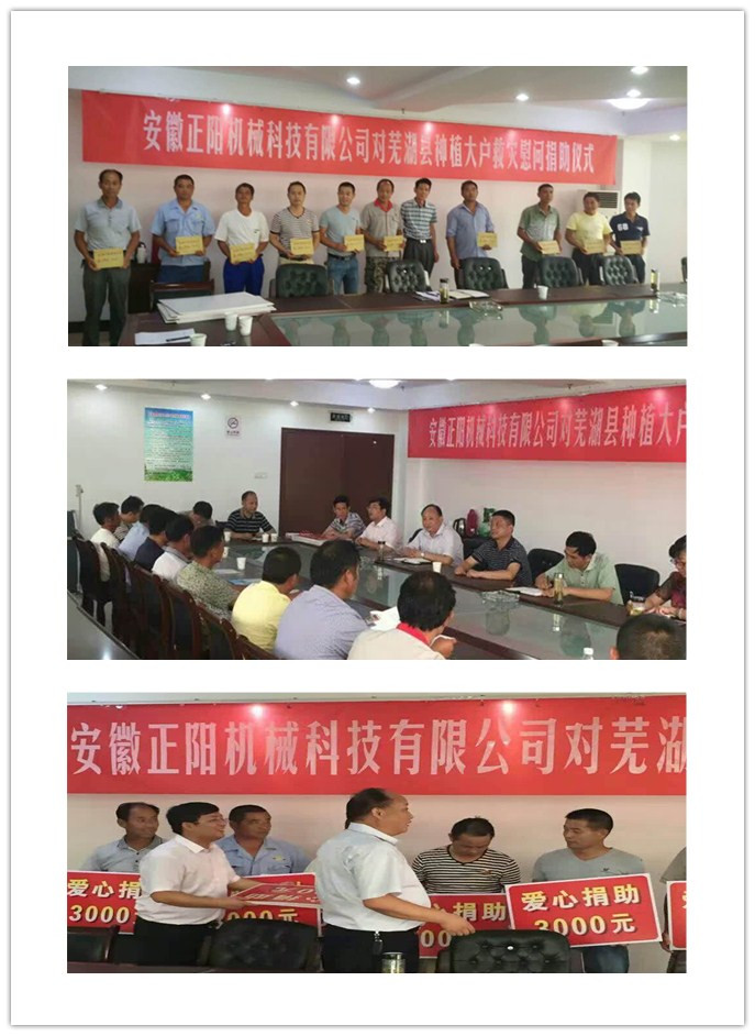 正陽公司員工捐款名單           同時我公司針對今年長江中下游、江淮區(qū)域發(fā)生的嚴(yán)重的洪澇災(zāi)害勇于擔(dān)當(dāng),注重快速發(fā)展自身的同時更高度重視企業(yè)社會責(zé)任,本著以回報社會為己任;企業(yè)利潤來之于民、用之于民;義利兼顧的宗旨,安徽正陽機(jī)械科技有限公司總經(jīng)理張為法于2016年7月13日下午前往“正陽”糧食烘干機(jī)主銷區(qū)域安徽蕪湖、六安、湖北孝感等受災(zāi)嚴(yán)重地區(qū)捐贈現(xiàn)金數(shù)十萬元,幫助災(zāi)區(qū)人民萬眾一心共抗洪災(zāi),盡快恢復(fù)生產(chǎn),讓受災(zāi)群眾真實(shí)感受到黨和政府的溫暖、民營企業(yè)家的責(zé)任,公司以正能量品牌的形象和風(fēng)范履行了自身應(yīng)盡的社會責(zé)任。