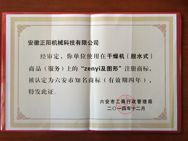 近日,安徽正陽機(jī)械科技有限公司“zenyi”牌干燥機(jī)(脫水式)商標(biāo)經(jīng)過申報、評選、公示等程序,正式被六安市工商行政管理局認(rèn)定為“六安市知名商標(biāo)”。這是公司全體員工共同努力的結(jié)果,是六安市工商行政管理局等政府職能部門親切關(guān)懷和大力支持的結(jié)果,標(biāo)志著安徽正陽機(jī)械科技有限公司在品牌化戰(zhàn)略發(fā)展道路上又前進(jìn)了一大步。